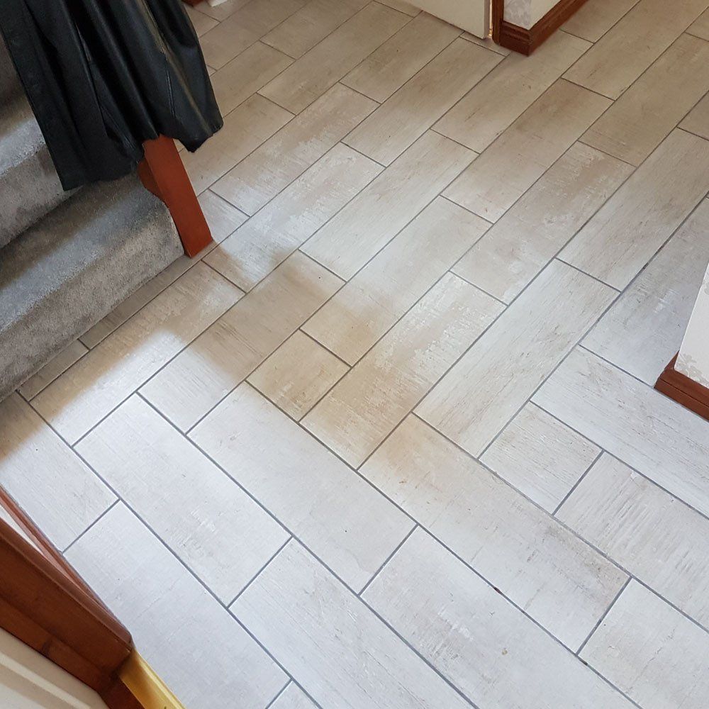 We removed original tiles and retiled hallway staggered and with stone effect porcelain tiles.